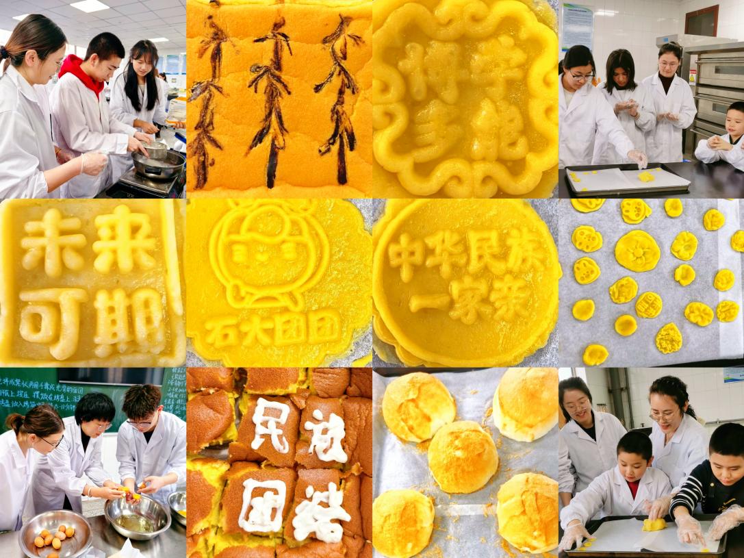 师生们尝试用不同的模具压制出了“博学多能”、“未来可期”、“中华民族一家亲”等纹样,小小的蛋糕胚成为了民族团结的创意画布,各族师生在劳动中深化交流,诠释了“像石榴籽一样紧紧抱在一起”的深刻内涵。奶香萦绕间,团结之情愈发醇厚,他们共同品尝一起制作的蛋糕,分享这份甜蜜。