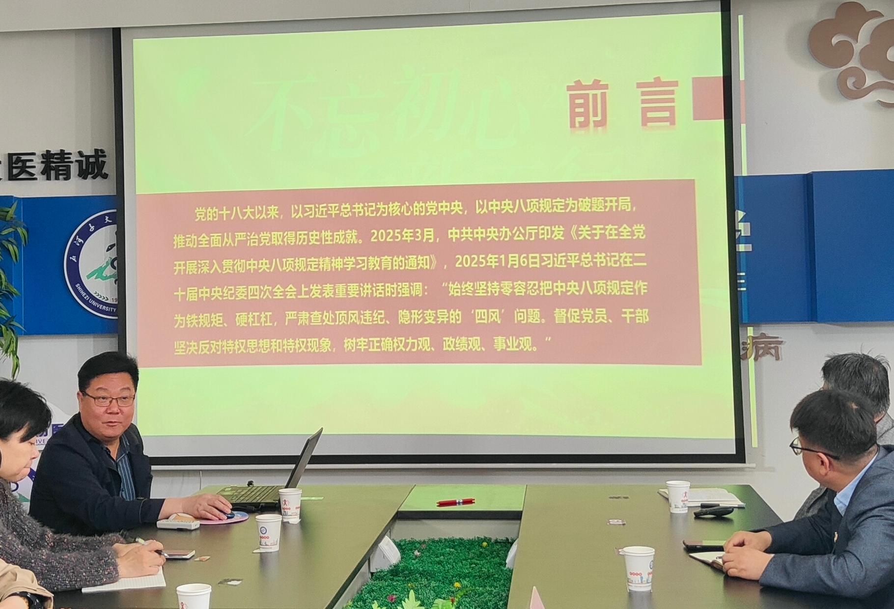 宣讲会上,张青书记以《以中央八项规定精神领航新征程——新时代全面从严治党的政治保证》为主题,从“什么是八项规定、为什么学习八项规定、如何深入贯彻实施八项规定”三个方面深入浅出地进行讲解。他首先系统阐述了八项规定的具体内容和精神实质,让党员教师对这项党内重要规定有了更清晰、全面的认知;随后,结合新时代全面从严治党的形势与学院发展需求,深入剖析学习八项规定的重要意义,强调这不仅是加强党风廉政建设的必然要求,更是推动学院各项事业高质量发展的重要保障;最后,提出深入贯彻实施八项规定的具体路径,并结合预防医学系实际着重指出,预防医学系作为学院在公共卫生与疾病预防领域的重要力量,在开展科研项目、学术交流、社会服务等工作中,要严格规范经费使用、活动组织等环节,将纪律意识融入每一项工作流程,真正做到把纪律意识融入日常教学科研服务。同时,张青书记强调,中央八项规定是长期有效的铁规矩,全体党员教师必须从细微之处着手,时刻保持警醒,筑牢拒腐防变的思想防线。