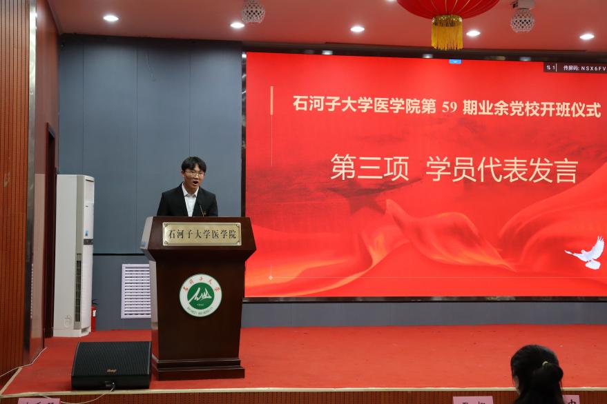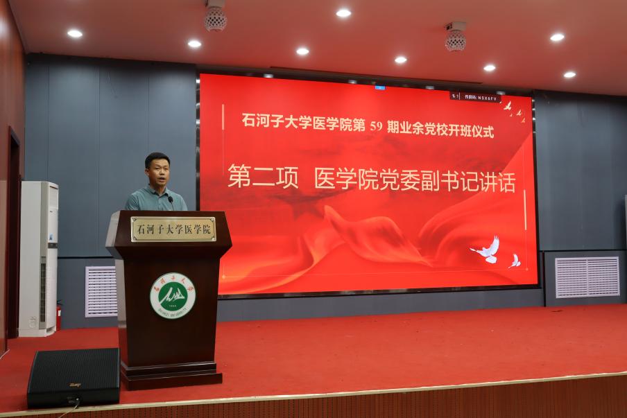 在开班仪式上,学院党委副书记雷建鹏致辞。他强调,党课培训是学院加强思想政治教育、培育新时代优秀人才的重要举措,对于大学生而言,是学习党的理论知识、提升政治素养、坚定理想信念的关键平台。党的全心全意为人民服务宗旨与医学守护生命、救死扶伤的使命高度契合,深入学习党的理论,有助于同学们将个人成长融入为人民健康服务的伟大事业中。希望同学们能够在本次培训中汲取理论知识,补足精神之钙,为党和国家事业发展注入新的希望与活力。