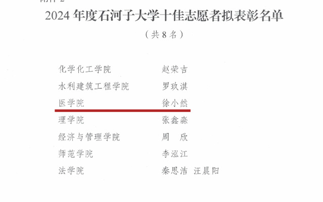 近年来,学院高度重视志愿服务体系建设,通过构建"专业+实践"育人模式,打造特色品牌项目,引导青年学子将专业知识与社会责任相结合。徐小然同学的优异成绩,既是个人成长的生动写照,也是学院深化实践育人的成果体现。期待更多医学生以此为榜样,在志愿服务中锤炼本领,用青春力量书写新时代医学人的使命担当!