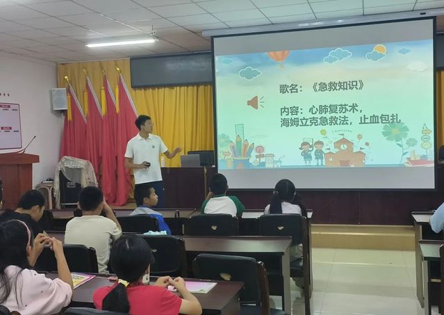 接下来是关于心肺复苏的科普时间,团队成员从评估现场环境开始讲起,随后是检查患者的意识和呼吸,通过拍打肩膀呼喊和观察胸部起伏来判断;再到胸外按压的具体要点:按压位置、按压深度以及按压频率等;之后是开放气道的“仰头提颏法”以及人工通气时的注意事项。每一个步骤,团队成员都进行了细致的演示和讲解,为孩子们在突发情况时提供了安全可靠的行动指南。