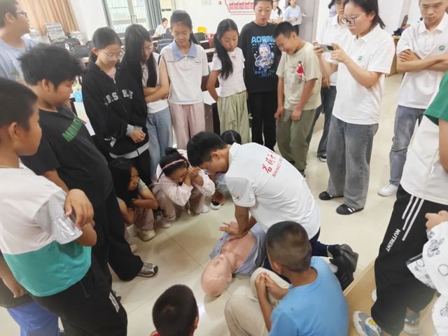 接下来是关于心肺复苏的科普时间,团队成员从评估现场环境开始讲起,随后是检查患者的意识和呼吸,通过拍打肩膀呼喊和观察胸部起伏来判断;再到胸外按压的具体要点:按压位置、按压深度以及按压频率等;之后是开放气道的“仰头提颏法”以及人工通气时的注意事项。每一个步骤,团队成员都进行了细致的演示和讲解,为孩子们在突发情况时提供了安全可靠的行动指南。