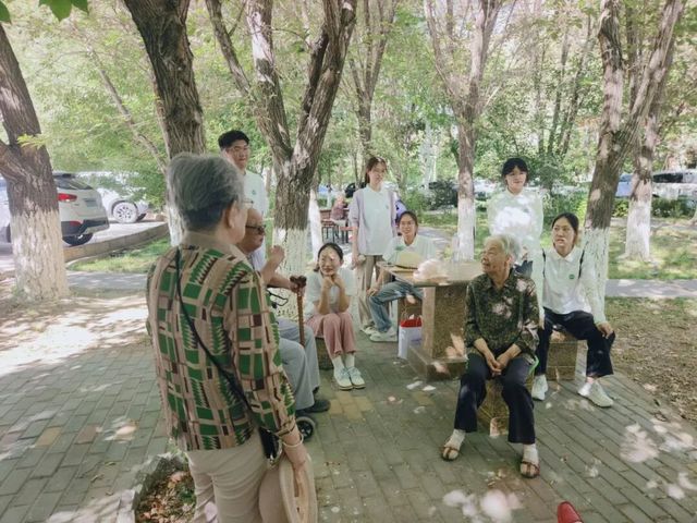 在亲切的交谈中,老人们深情回顾了兵团早期的峥嵘岁月:初抵北屯时,面对茫茫荒野,筚路蓝缕、艰苦创业。当老人们感慨从求温饱到享安康的人生跨越时,实践团成员们深受触动,纷纷表示要将老一辈兵团人献了青春献终身的奉献精神转化为献了终身献子孙的传承实践,让红色基因在边疆健康事业中永续流淌。