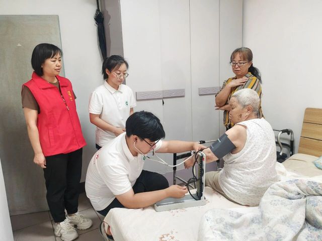 团队成员在九师光明路社区为行动不便老人测量血压