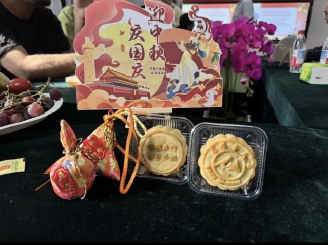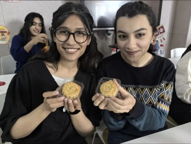 活动在“品月饼话中秋” 环节达到高潮。办公室的老师精心准备了印有石河子大学校徽以及校训的定制月饼,这些月饼都是五仁、莲蓉、豆沙、蛋黄等传统口味。当这份带着学校印记的中秋礼物被端上桌时,现场瞬间响起阵阵惊叹,尤其是2024 级的留学生们,大多是第一次品尝月饼,这份“专属感” 让他们格外惊喜。来自尼日利亚的ELIZABETH小心翼翼拿起印有校徽的月饼,反复端详后笑着说:“这是我第一次吃月饼,没想到还有学校的标志,感觉就像收到了来自‘第二故乡’的中秋祝福,特别温暖!”