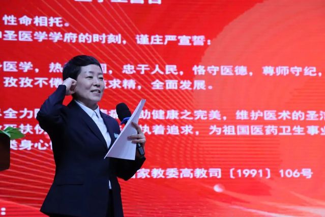 教师代表、预防医学系胡云华副教授以“独立之志、卓越之志、勤勉之志”为关键词,叮嘱新生尽快适应大学自主学习模式,铭记“健康所系,性命相托”的医者初心。她动情地说:“我们将以严谨治学和温暖陪伴,诠释‘大医精诚’的内涵。”