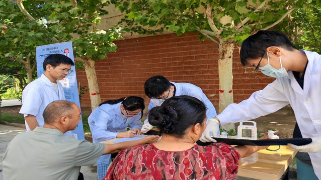 清晨时分,社区广场上已整齐排开桌椅和检测设备,医学生们身着白大褂,迅速投入紧张的准备工作,仔细校准血压计、血糖仪,并布置登记台。这是团队深入社区开展慢性病筛查的第三天,大家精神饱满,准备迎接居民的到来。上午十点,前来检测的社区居民络绎不绝,有序排起长龙般的队伍,在学生的引导下,依次完成信息登记、血糖血压测量、数据记录等环节。随着气温渐渐升高,汗水浸透了同学们的白大褂,但他们始终坚守岗位,无一人懈怠。面对血压或血糖异常的居民,学生们不仅细致讲解慢病防控要点,如饮食调整和定期监测的重要性,还提供个性化建议,耐心解答疑问。为扩大筛查覆盖面,同学们还将服务点移至人流量更大的社区入口处,重新搭建临时站点,确保不遗漏任何一位有需求的居民。一天的辛劳虽令人疲惫不堪,但居民们竖起的大拇指、递来的清凉糖果和营养牛奶,以及声声真挚的感谢,成为对同学们辛勤付出最温暖的褒奖,让大家倍感鼓舞。