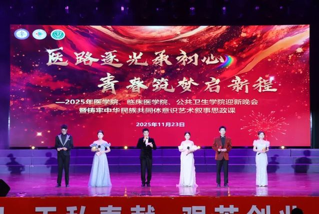 迎新晚会由王海楠、刘蒙恩、郝嘉琪、丁郅航、赵亚萱、杜匡生共同主持,以“医路逐光承初心 青春筑梦启新程”为主题,通过序章“初遇・天山为证”及三大篇章“初心・医路启航”“芳华・筑梦时光”“逐梦・未来可期”,为全场师生呈现了一场兼具艺术性、思想性与时代性的视听盛宴。