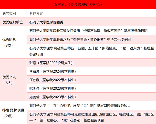 此次多项表彰的获得,是对篮球即时比分 “理论与实践相结合、人才培养与服务社会相统一”育人模式的充分肯定。未来,篮球即时比分 将继续深化实践育人内涵,引导更多医学生把论文写在祖国大地上,把服务送到基层最需要的地方,以青春之力助力健康兵团、健康中国建设,让青春在火热实践中绽放绚丽之花。